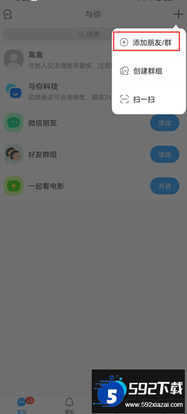 3. 在弹出的窗口中,选择“添加朋友/群”选项;