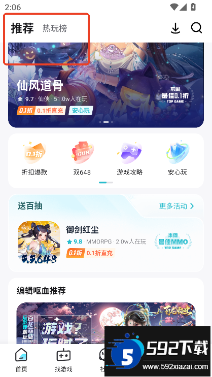 进入首页后可以浏览推荐内容和热门游戏排行榜