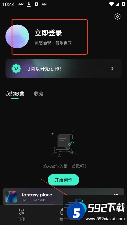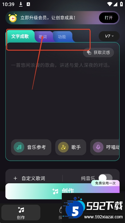 1、进入应用首页,可选择文字成歌或歌词生成等功能;