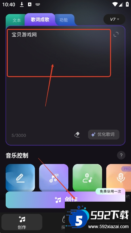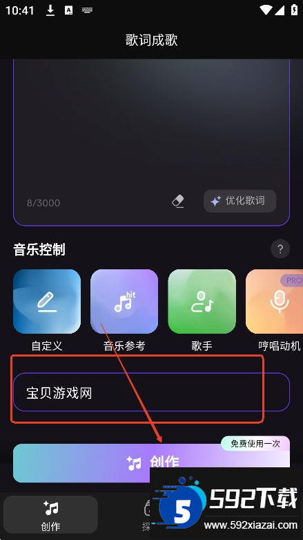 2、以生成歌词为例,在文本框输入关键词或音乐风格描述;
