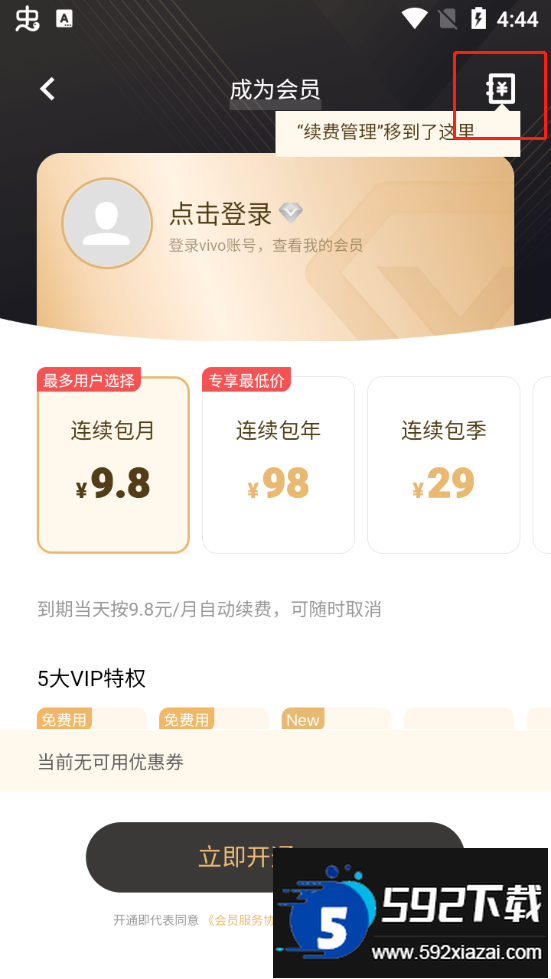 3、进入会员页面后,点击右上角的【续费管理】,在此处关闭自动续费功能。