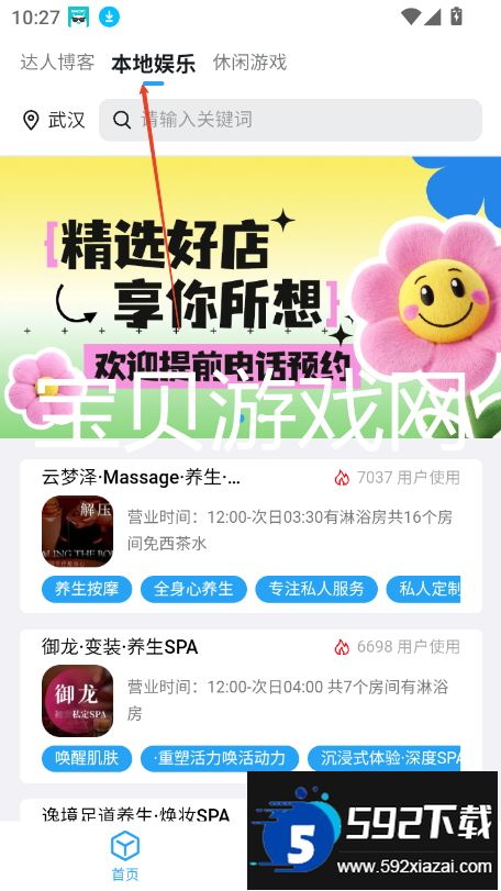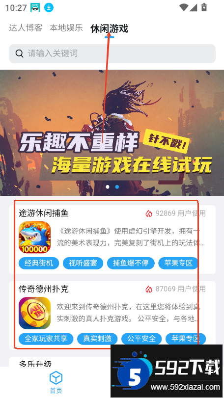 1、打开应用进入首页,界面划分清晰,设有达人博客、休闲游戏、本地娱乐等多个内容板块;