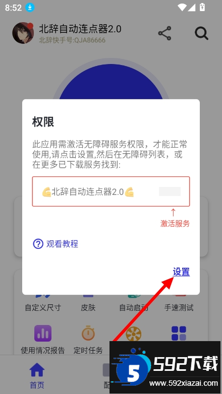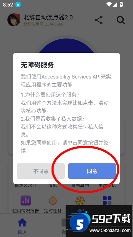 在指定网站下载并安装北辞自动连点器2.0手机版,启动后点击同意进入应用;