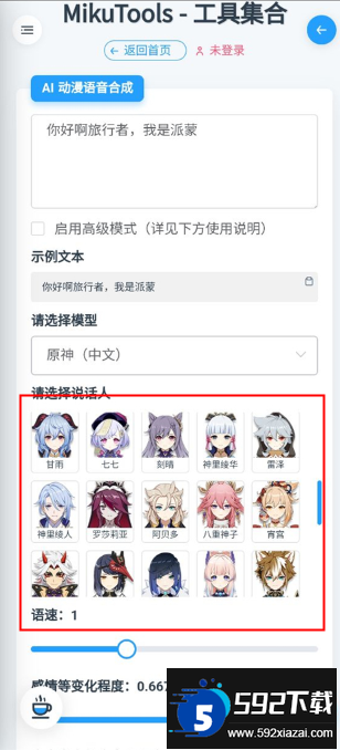 输入想要合成的文本内容,选择汉语或日语,并调整人物语速等参数。