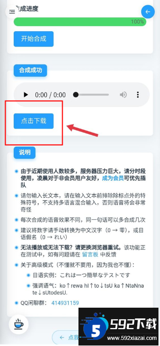 等待合成进度结束,即可试听或下载导出的语音文件。