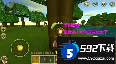 1. 玩家出生地点随机,可能出现在沙漠、雪原、森林或平原。无论身处何地,第一要务都是砍树。选中快捷栏上的斧头,对准树干长按,进度条满后即可砍下,靠近掉落的小木块即可自动拾取。收集至少十个木头后,进行下一步。