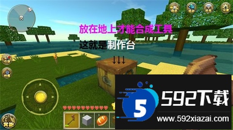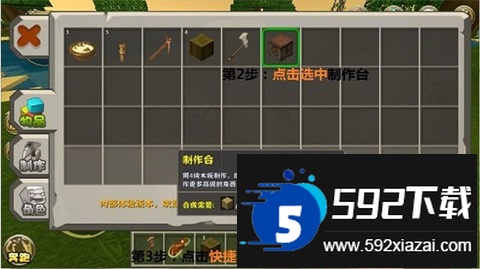2. 合成制作台。制作台是合成各类道具的基础工具。打开背包,用木头合成工作台;若快捷栏已满,制作台会暂存于背包。打开背包,点击道具再点快捷栏空格即可切换放置。将制作台放在快捷栏后,点击地面即可放置,再次点击打开合成界面。