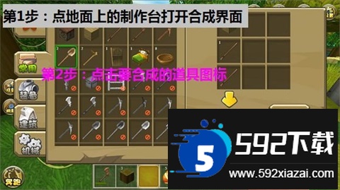 3. 制作工具。打开地面上的制作台,优先合成木铲,可快速挖掘泥土、沙砾。当拥有相应材料时,可合成的物品会自动显示。例如,床需要木板与羊毛,拥有其中一种材料,床的配方就会显现。