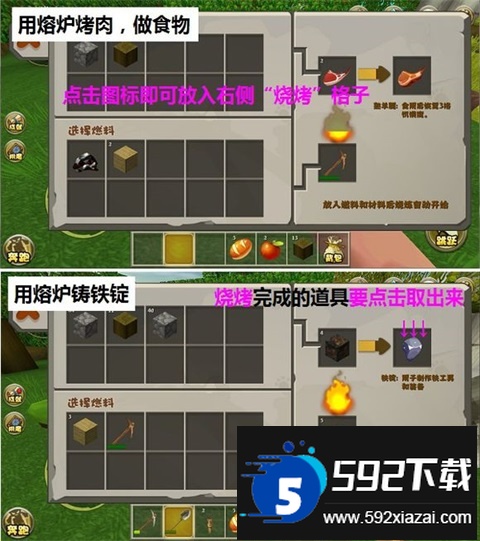 熔炉由石块合成,可将生肉烤熟,也能烧制铁锭与玻璃。将肉块与燃料放入,等待片刻即可。