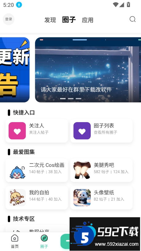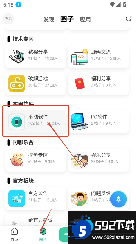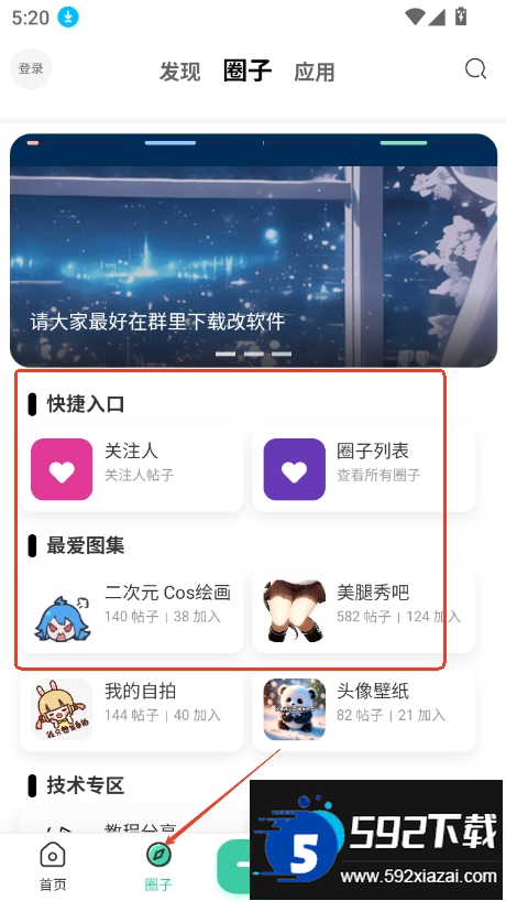 2、进入圈子板块,能发现各类主题圈子或有趣的应用推荐。