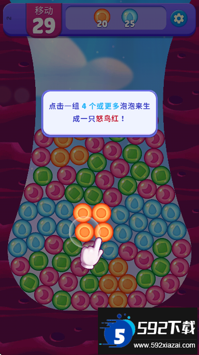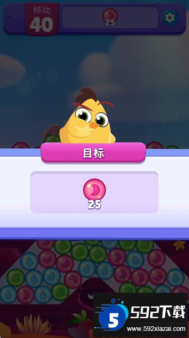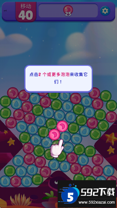 第一关需要消除25个粉色月亮图案的泡泡;操作很简单,点击两个或更多颜色图案相同的泡泡就能将它们消除。