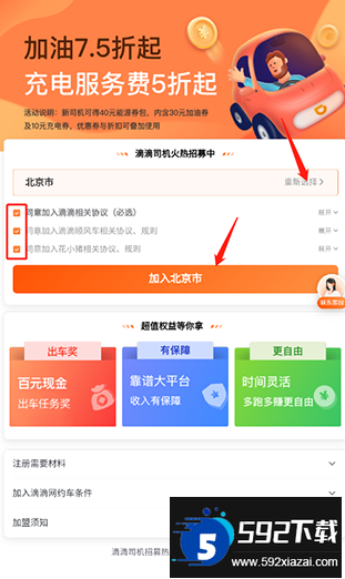 4、选择计划运营的城市,阅读并同意相关协议,点击加入按钮,此处以北京市为例;