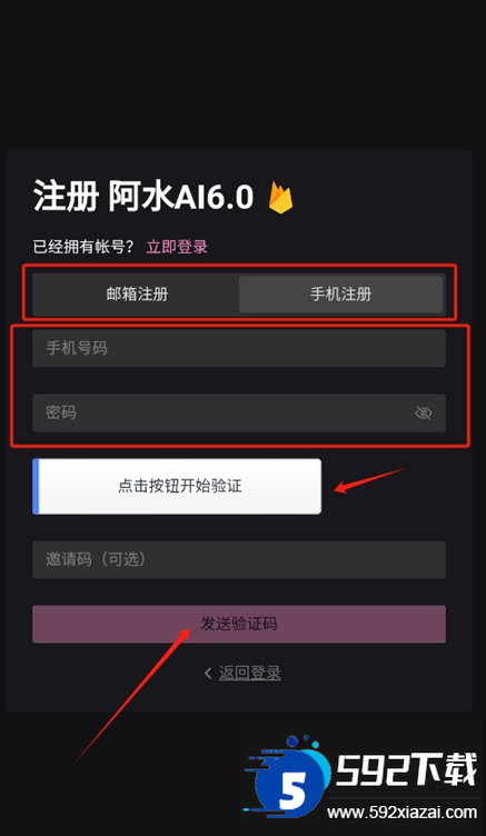 选择手机注册时,输入手机号码并设置密码,完成验证后点击发送验证码即可快速完成注册。