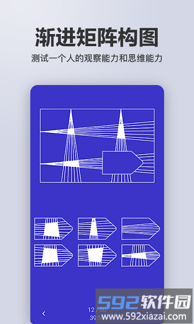 - 测评包含60道难度递增的图形推理题,需要选择正确几何图形完成整体图案