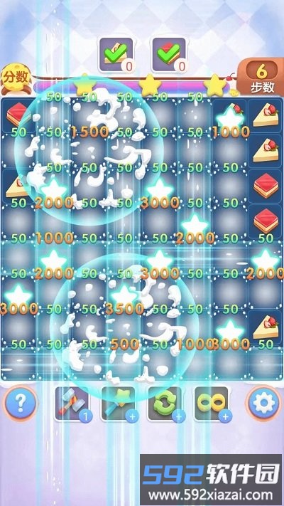 1、纵向横向连接相同图案,五连消将生成特殊糖果炸弹。完成每关特定收集任务,即可打开传送门进入新地图