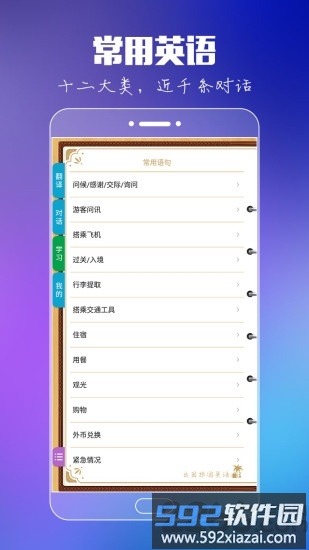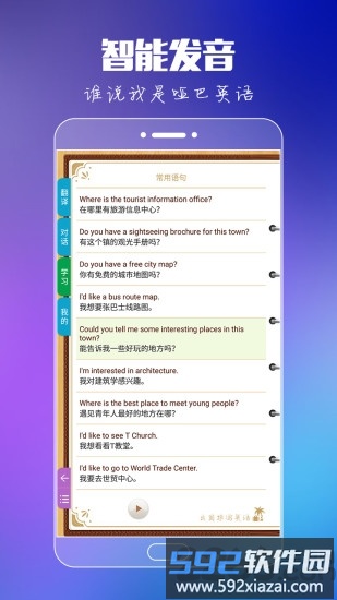 7.精选旅行必备词句库,十二类别近千组实用对话,配备双语对照与语音跟读,生词短语自动转译发音。