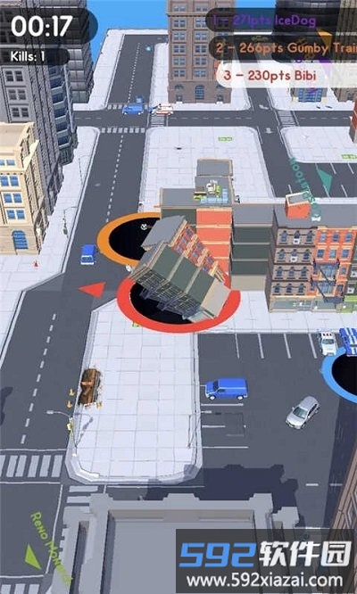 3、成长路线抉择,专注吞噬建筑快速涨体积,或潜伏在交通要道狩猎其他玩家。