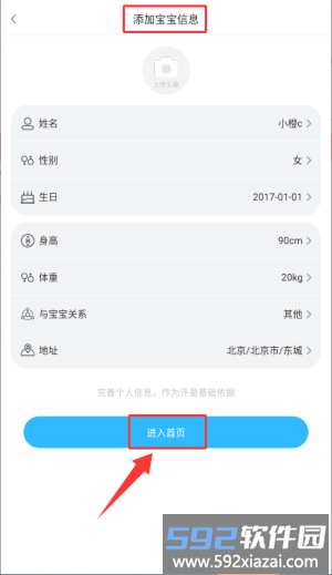 2、在宝宝信息页面完善姓名、性别等基本信息,确认后即可进入主界面。