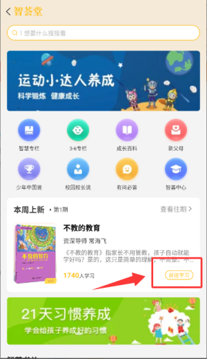 3、从首页找到家庭课堂入口,进入后可浏览智荟堂各类育儿专栏。