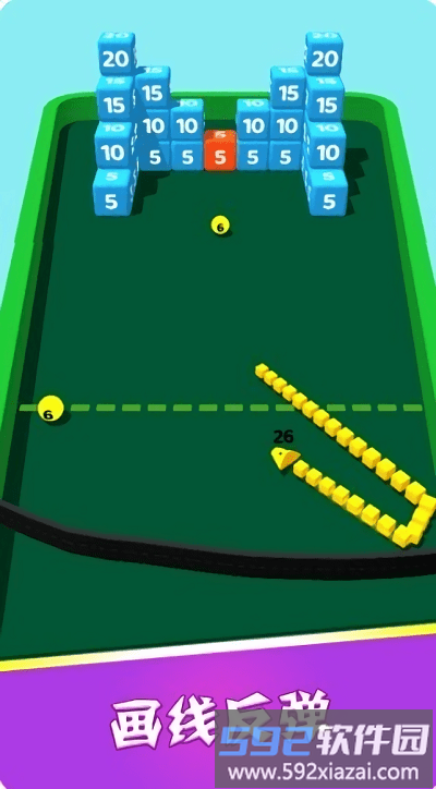 3、操控由圆球串成的贪吃蛇,避开障碍、撞击方块,拿到足够分数就能过关。